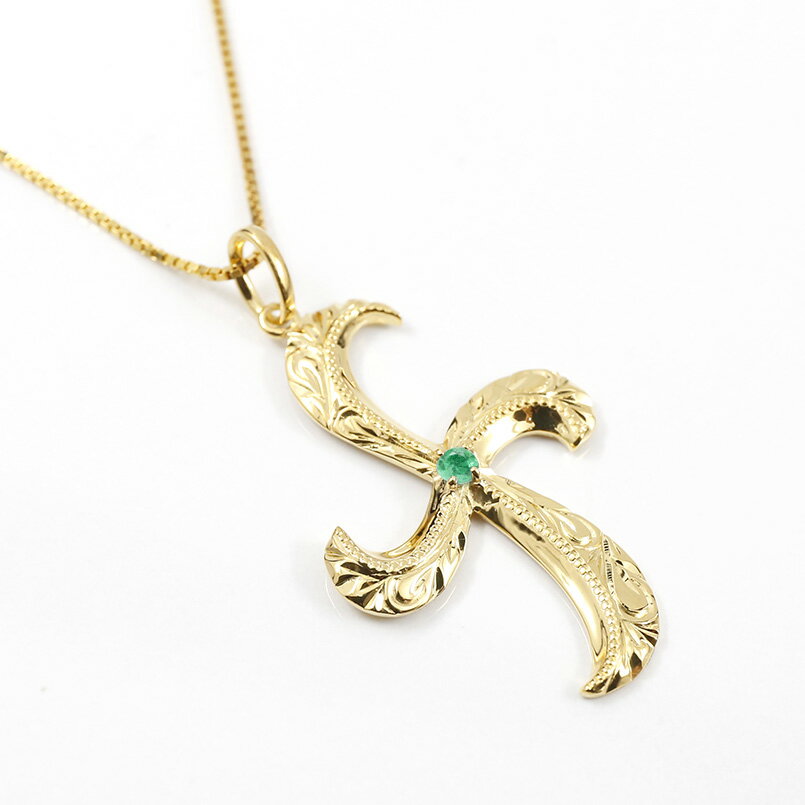 18金 18k ハワイアンジュエリー メンズ ネックレス イエローゴールドk18 クロス エメラルド ペンダント トップ 十字架 ミル打ちデザイン トレジャーハンター 男性用 送料無料