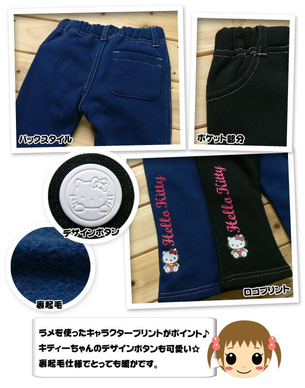 【特 長】 ・ロゴ/キャラクタープリント ・ラメ素材 ・デザインボタン ・ウエスト総ゴム ・裏起毛 【素 材】 ・(本体)ポリエステル65% 綿35% ・(ゴム編み部分)ポリエステル60% 綿35% ポリウレタン5% 【サイズ】 胴囲 股上 股下 腿幅 【80】 38-48 18 24 14 【90】 40-50 19 19 15 【95】 41-52 20 31 16 (単位:cm) 実際に採寸した平均値です。